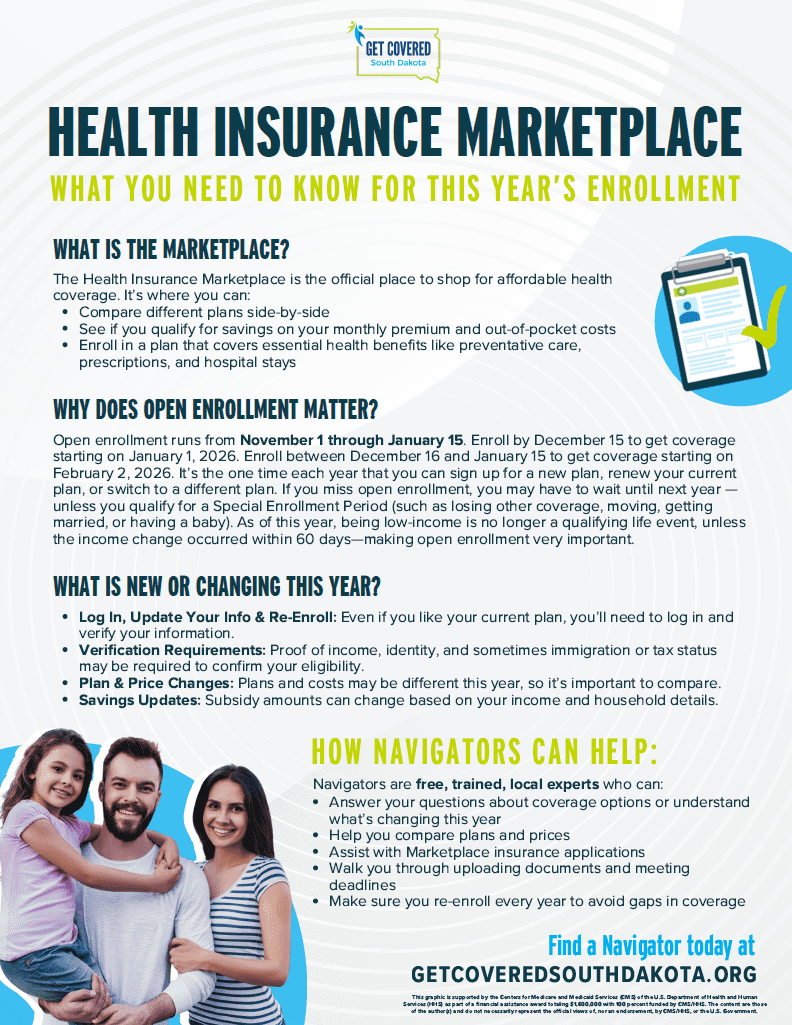 You still have options through the health insurance Marketplace—and you may even qualify for extra savings to make your monthly costs more affordable. You have 60 days before or after losing your coverage to enroll in a Marketplace plan. Get Covered South Dakota and their Navigators are here to answer your questions and walk you through your options. Let’s get you covered at GetCoveredSouthDakota.org.