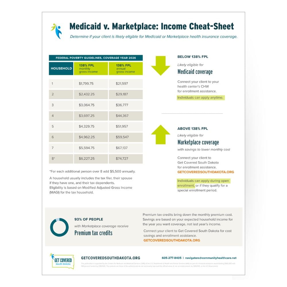 Use this sheet to see whether clients are likely eligible for Medicaid or Marketplace coverage based on household size and income.